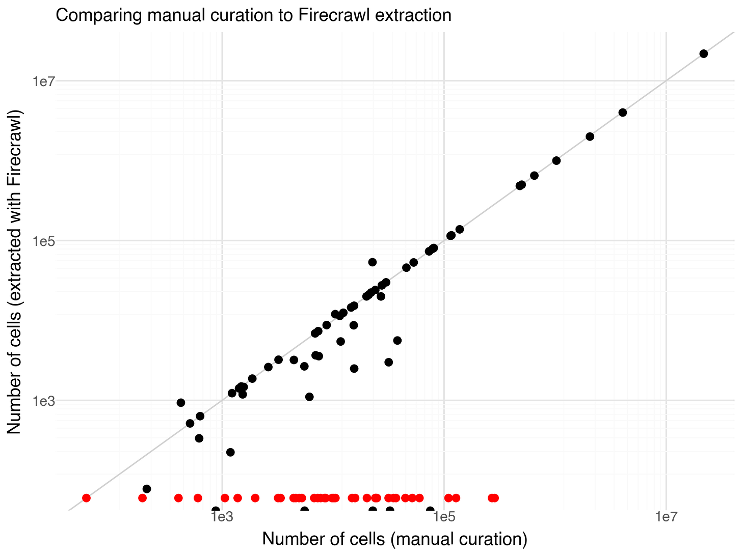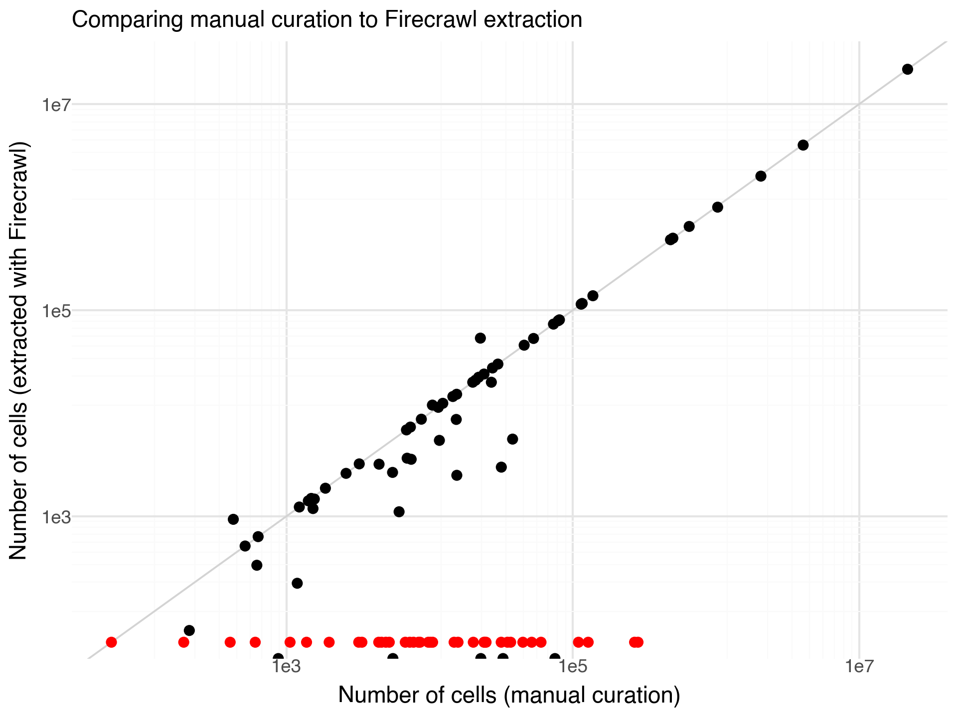 The results had the exact same counts for 27% of the papers. Some of the 35% of papers with different cell counts can be explained by a few specific observations: a couple of the ‘Reported cells total’ values have very round numbers (e.g., 24,000) while Firecrawl Extract numbers or nearby but less round (e.g., 24,023). In these cases the manual curation is probably inaccurate. In some more cases the situation is reversed, for example, manual curation has 1,027,401 while Firecrawl reports 1,000,000. I think these are cases of Firecrawl picking up rounded numbers from the abstract (’In this study we profile a million cells …’ or so). There are a number of cases where Firecrawl reports 0 cells in the papers, but does not indicate that the information is missing. I’m not sure why this is happening.