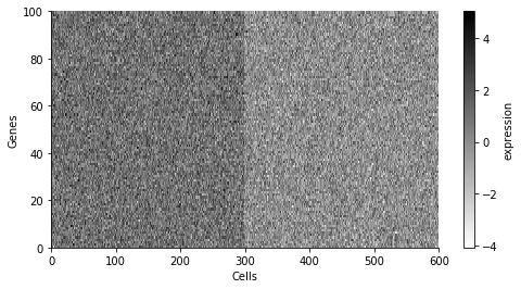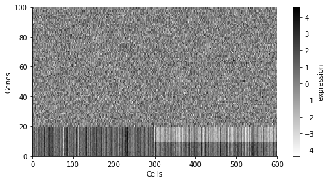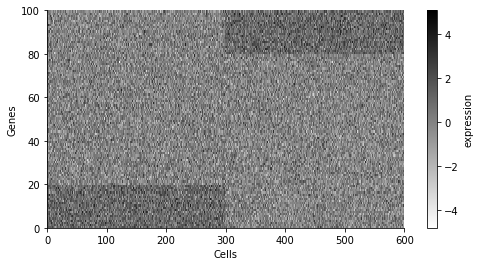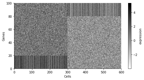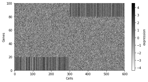 There are probably other ways to generate these typical patterns, but these were the first ones I stumbled on that made some sense. I've tried to keep the simulated expression matrices as simple as possible.