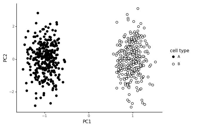 We get a pretty clear seperation between the cell types in PC1, and random variation in PC2. This is not a particularly realistic model for cell types however.