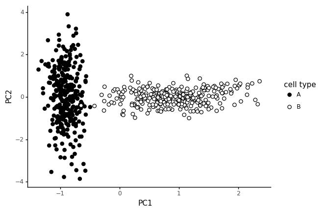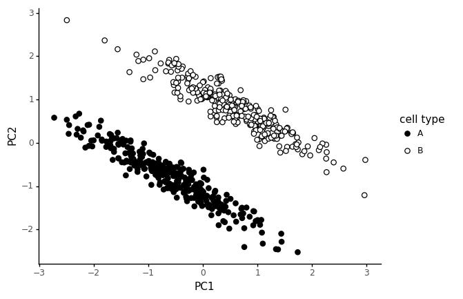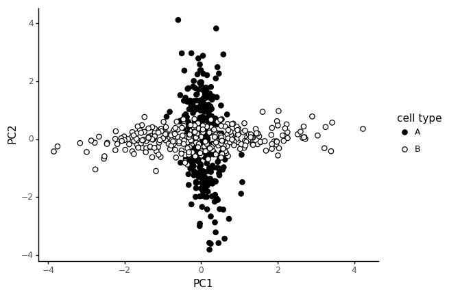 The first 300 cells are from cell type A, and the last 300 cells from cell type B. If we run a PCA on this, and color the cells by cell type, we get the following plot.