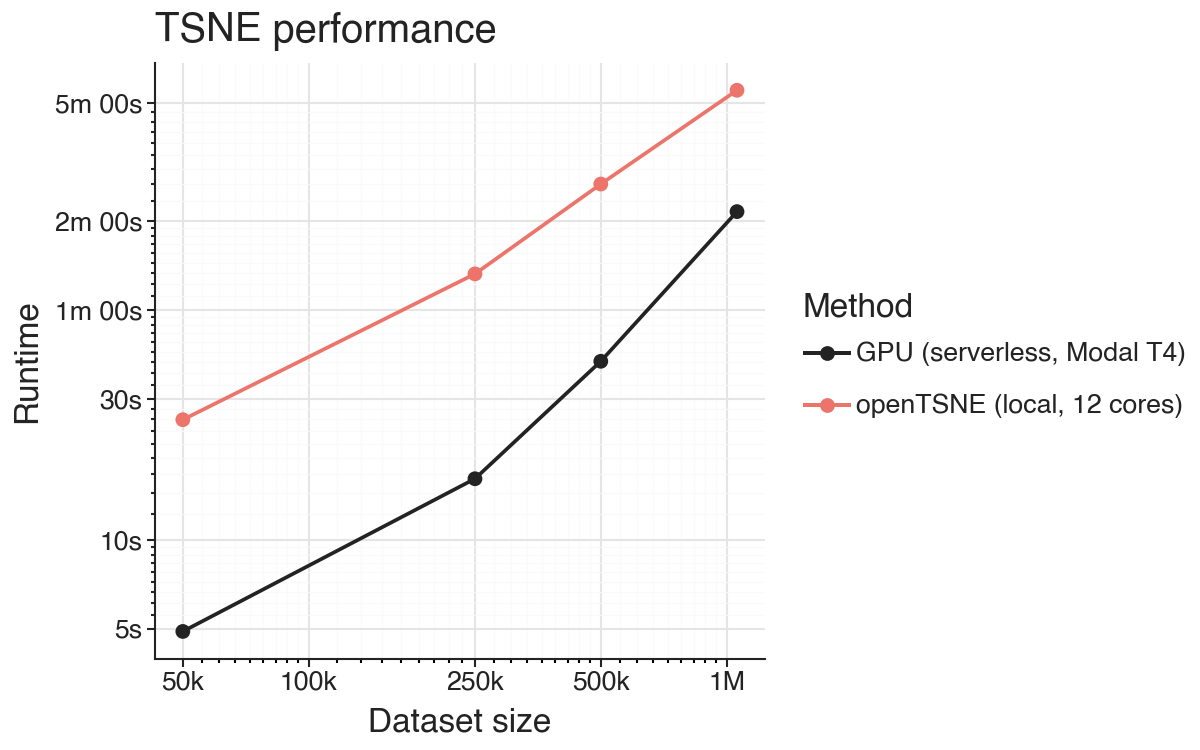 I created a small Modal service which performs TSNE using a serverless GPU with a local Python client library: https://github.com/vals/gpu-embedding-service. With this, running RapidsAI’s TSNE is just a matter of doing